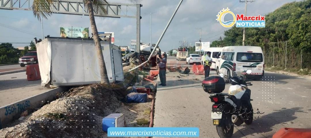 Cancún (Marcrix Noticias).-  Un aparatoso accidente sobre el bulevar Luis Donaldo Colosio dejó un saldo de al menos 2 personas lesionadas y cuantiosos daños materiales, así como un gran caos vial en la zona cercana al colegio St. Jhon’s.