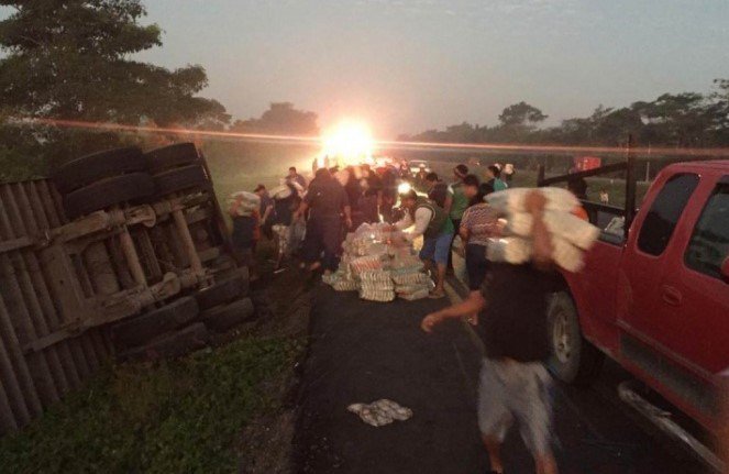 Tabasco. ( Marcrix Noticias).- La volcadura de un camión cargado con azúcar provocó rapiña y un fuerte congestionamiento vehicular sobre la carretera Villahermosa–Cárdenas, a la altura del retorno hacia Cucuyulapa.
