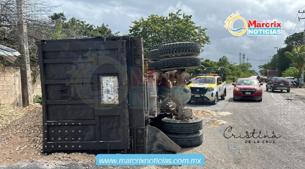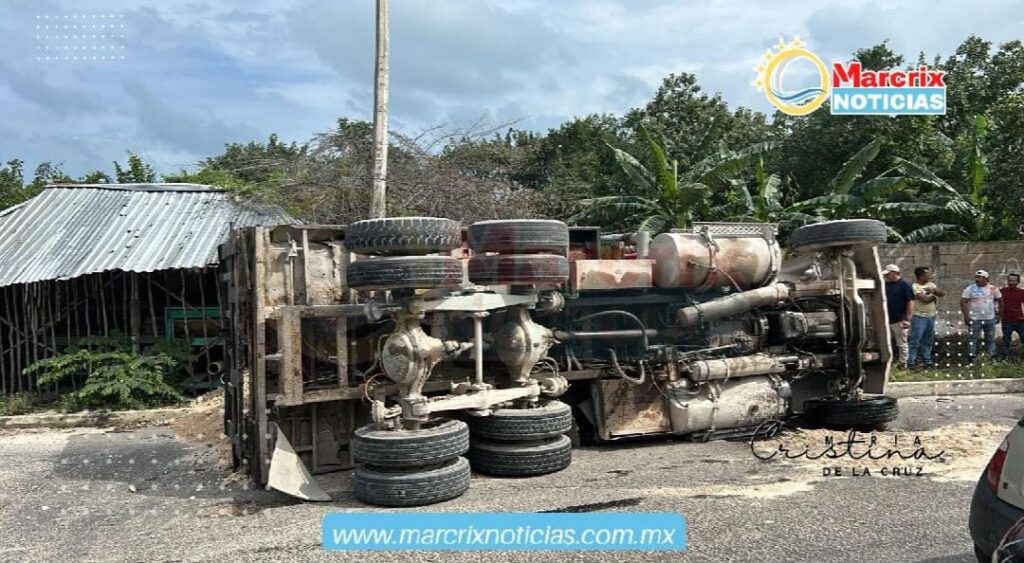 En este sitio, un volquete cargado del material conocido como Sascab terminó volcando hacia su costado izquierdo cuando trataba de incorporarse a la Diagonal Tulum.
