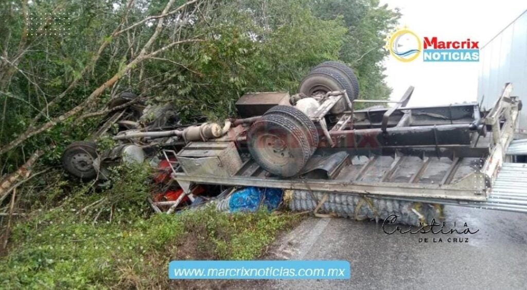 Cancún(Marcrix Noticias).- Un camión cargado con tubos de metal volcó luego de que el conductor perdió el control por conducir a exceso de velocidad, a la altura del kilómetro 260 de la carretera Leona Vicario-Valladolid Nuevo.