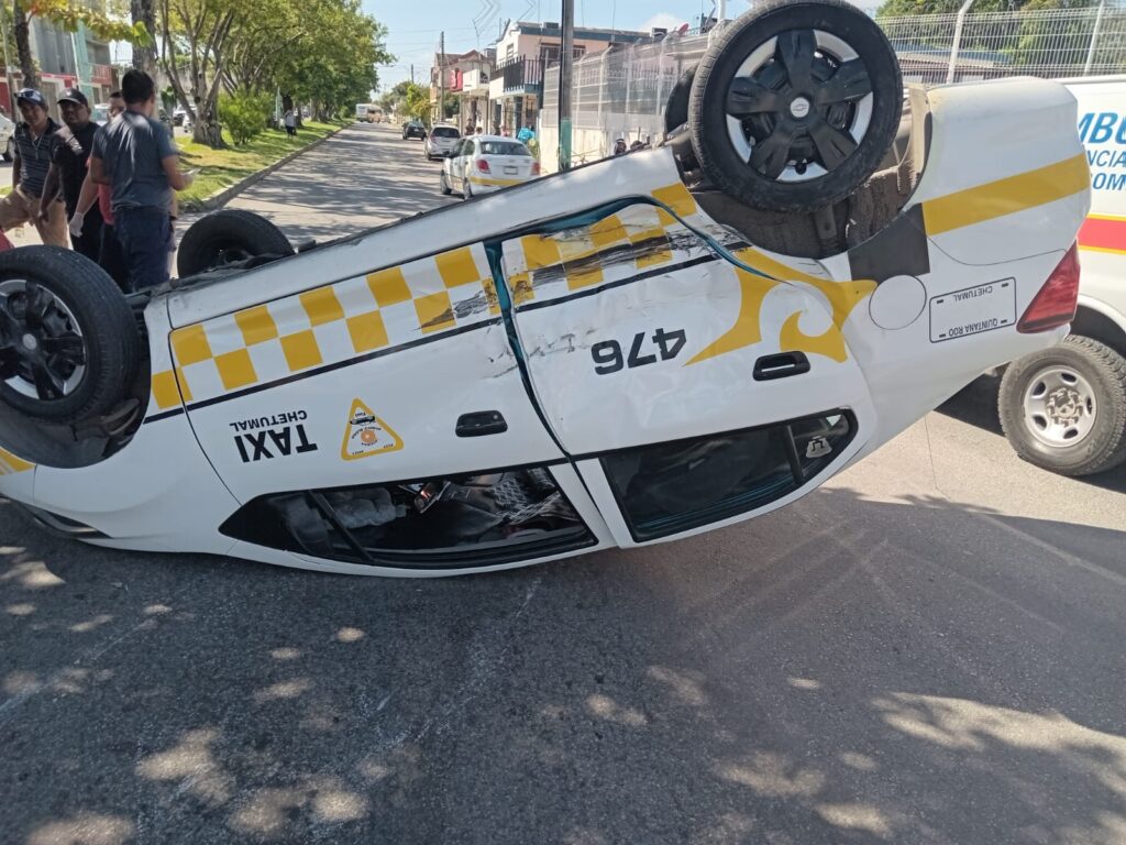 Chetumal (Marcrix Noticias). Un taxi de Chetumal terminó volcado totalmente al ser impactado por un automóvil particular.