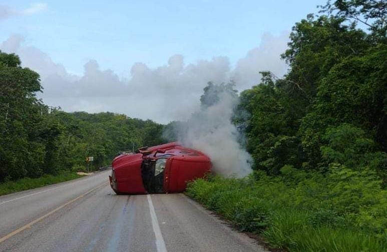 Chetumal(Marcrix Noticias).- Un aparatoso accidente se registró la mañana de este sábado en la Zona Sur de Quintana Roo, donde un tráiler terminó volcándose.