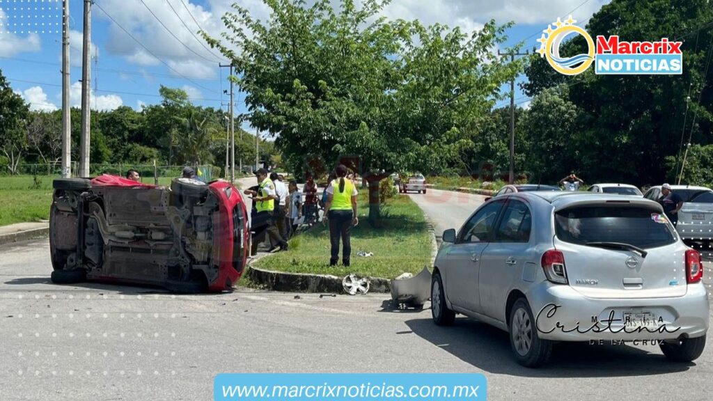 Cancún (Marcrix Noticias).- Un vehículo Nissan March se volcó tras trocar contra otro auto del mismo modelo, en el fraccionamiento Paseos Kabah.