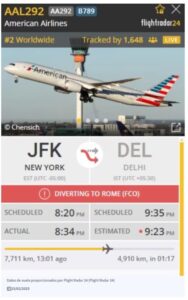 Italia (Marcrix Noticias).- Un vuelo de American Airlines, el AAL292, que viajaba desde Nueva York hacia Nueva Delhi, fue desviado a Roma, Italia, después de recibir una amenaza de bomba mientras sobrevolaba el mar Caspio, cerca de Turkmenistán.