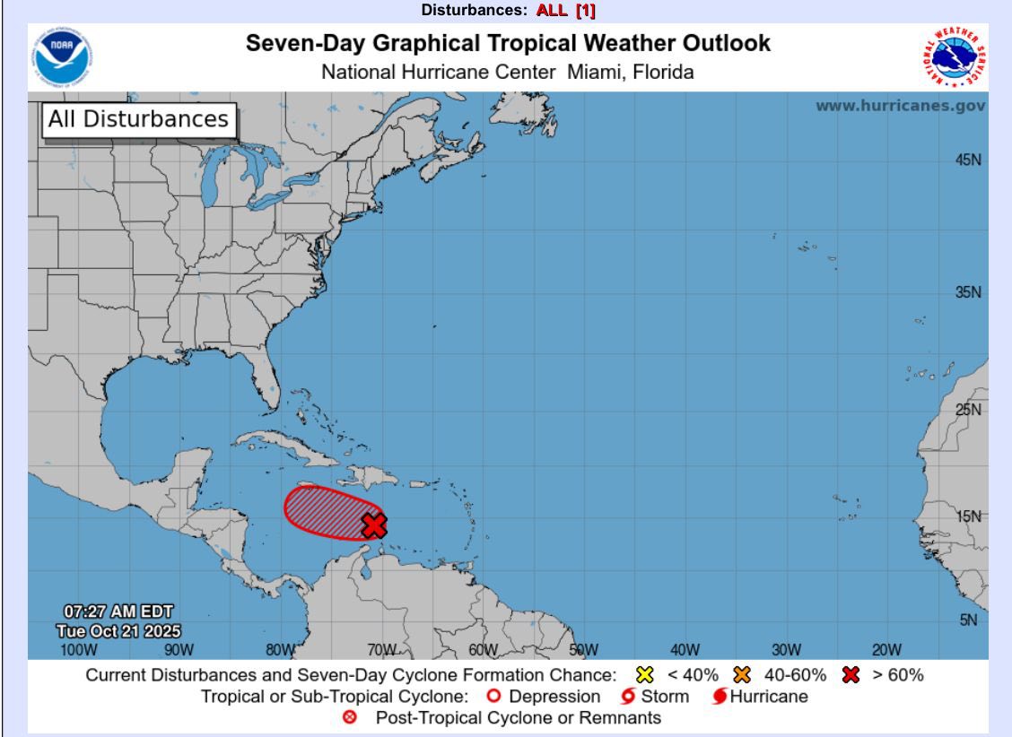 El fenómeno mantiene un 100% de probabilidad de desarrollo ciclónico, tanto en las próximas 48 horas como en siete días, mientras se desplaza hacia el oeste, con dirección al Mar Caribe.